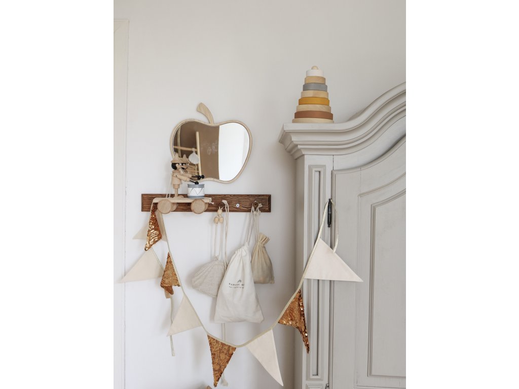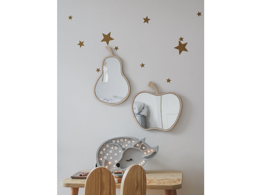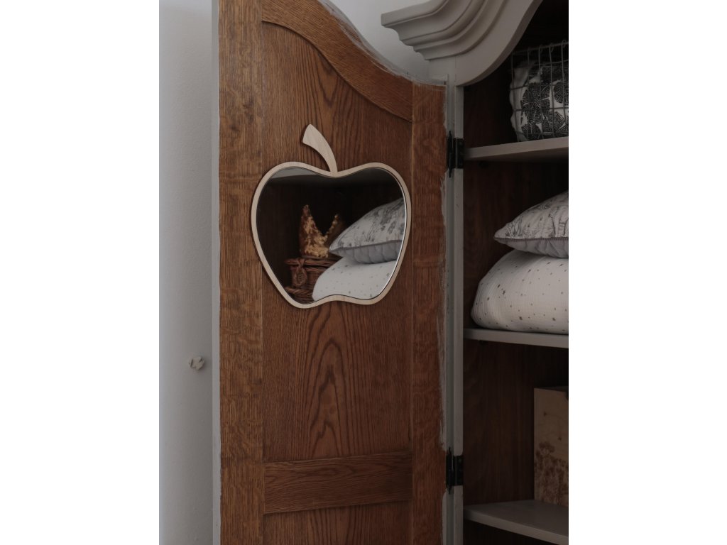 Zrcadlo ve tvaru jablka je jedním ze tří z řady ovocných zrcadel. Skvěle se hodí do vintage, skandinávských, minimalistických interiérů, ale i tradičních prostorů. Ze stejné série je i hruška a ananas, které se skvěle doplňují. Zrcátko je pro dítě zcela bezpečné díky tomu, že použité materiály jsou řádně vyleštěné a zrcátko je zrcadlový akrylát, který se neláme.