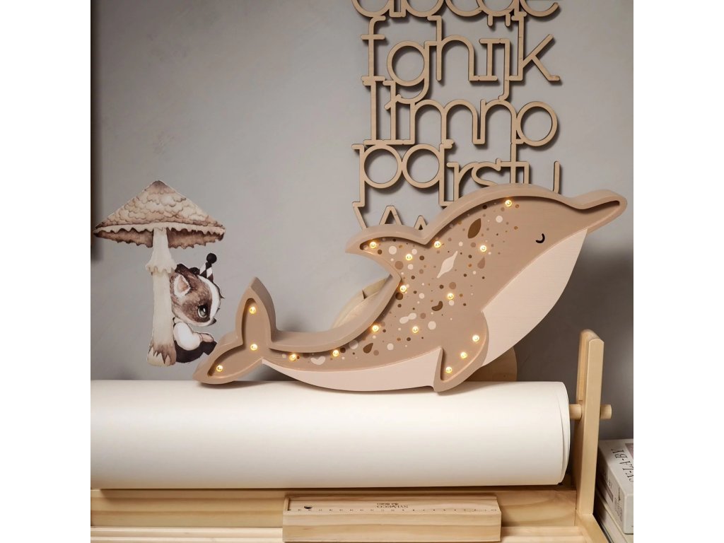 Dětská dřevěná ručně vyrobená noční lampička ve tvaru Delfína od roomGAGA.