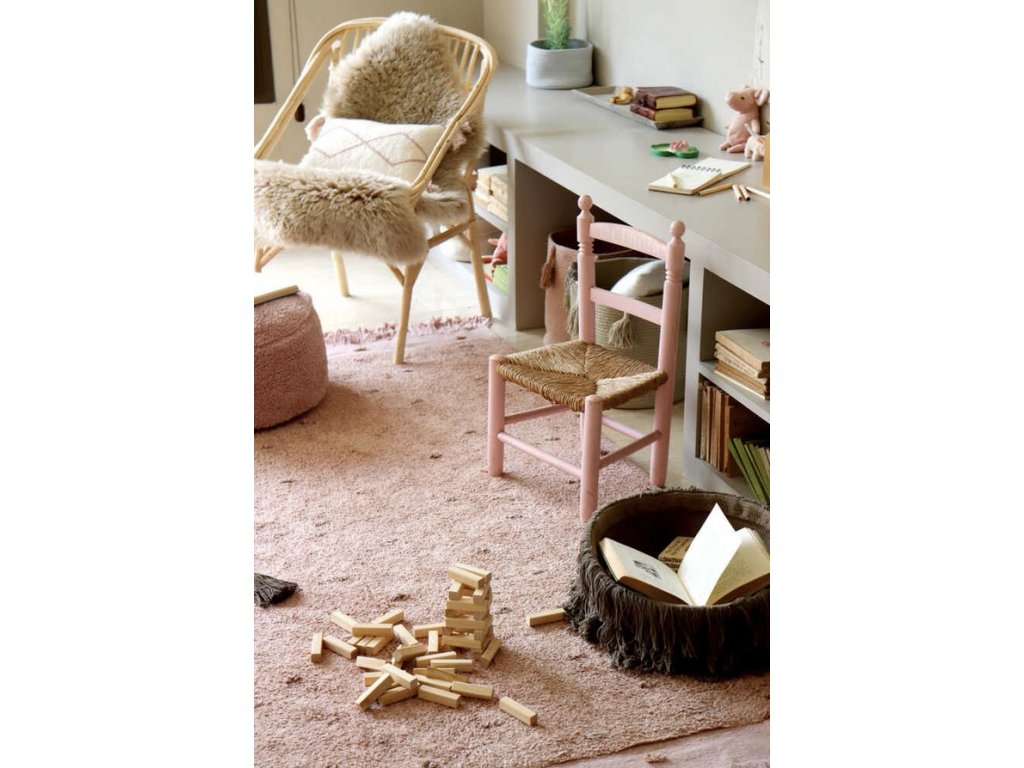 Růžový bavlněný kusový koberec s třásněmi od světoznámé značky Lorena Canals. Ručně vyrobený z ekologiocky nezávadného materiálu za férových podmínek.