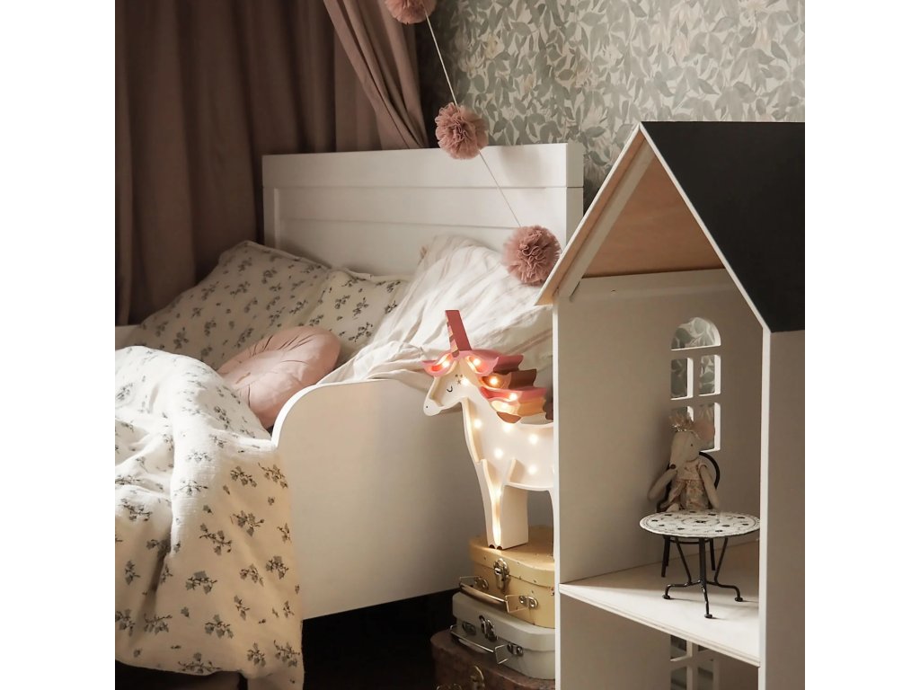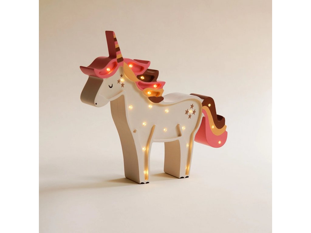 Krásná dětská noční lampička z borovicového dřeva, ve tvaru bílého jednorožce, která bude věrným společníkem Vašich dětí při usínání.