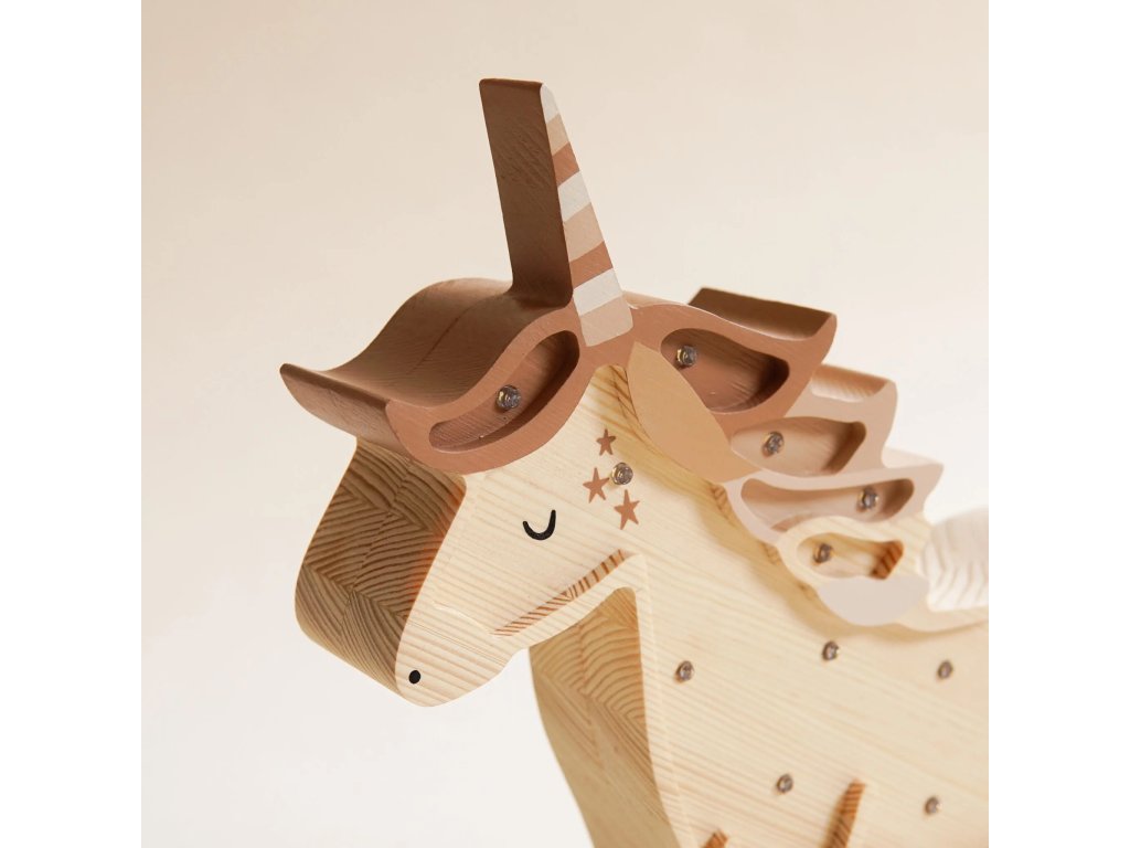Dětská dřevěná ručně vyrobená noční lampička ve tvaru Jednorožce v hnědých tónech od roomGAGA.